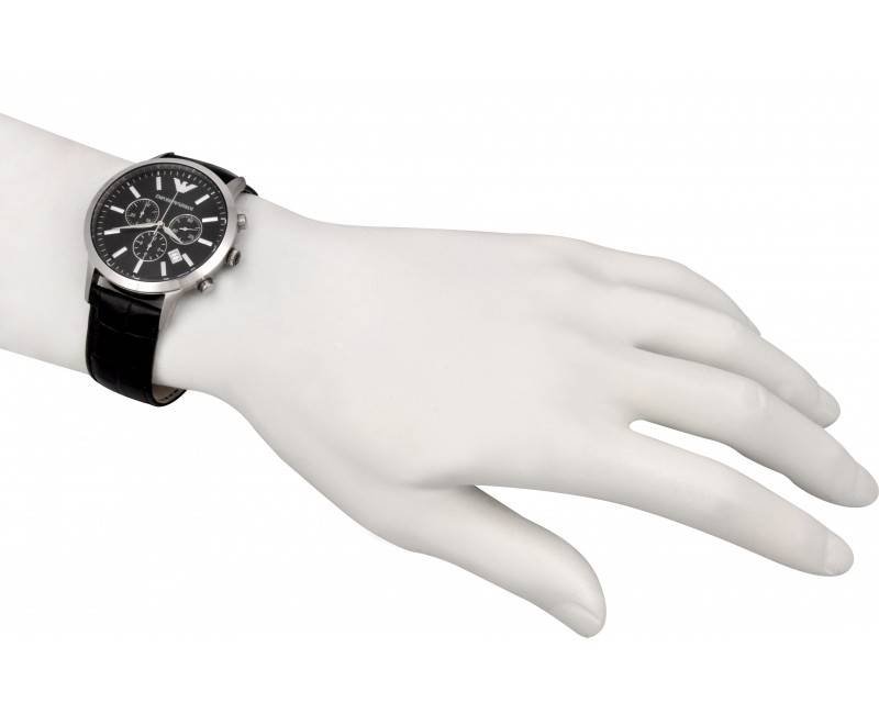 sportlicher Chronograph aus dem Hause EMPORIO ARMANI präsises lautloses japanisches Chronographen-Quarzwerk aus antiallergisches massivem Edelstahl gefertigt ARMANI Gravur am Edelstahlgehäuse und auf der Krone gehärtetes, leicht gewölbtes kratzfestes Mineralglas elegante Dornschließe am Lederarmband