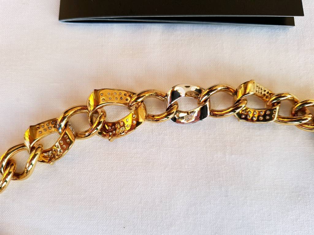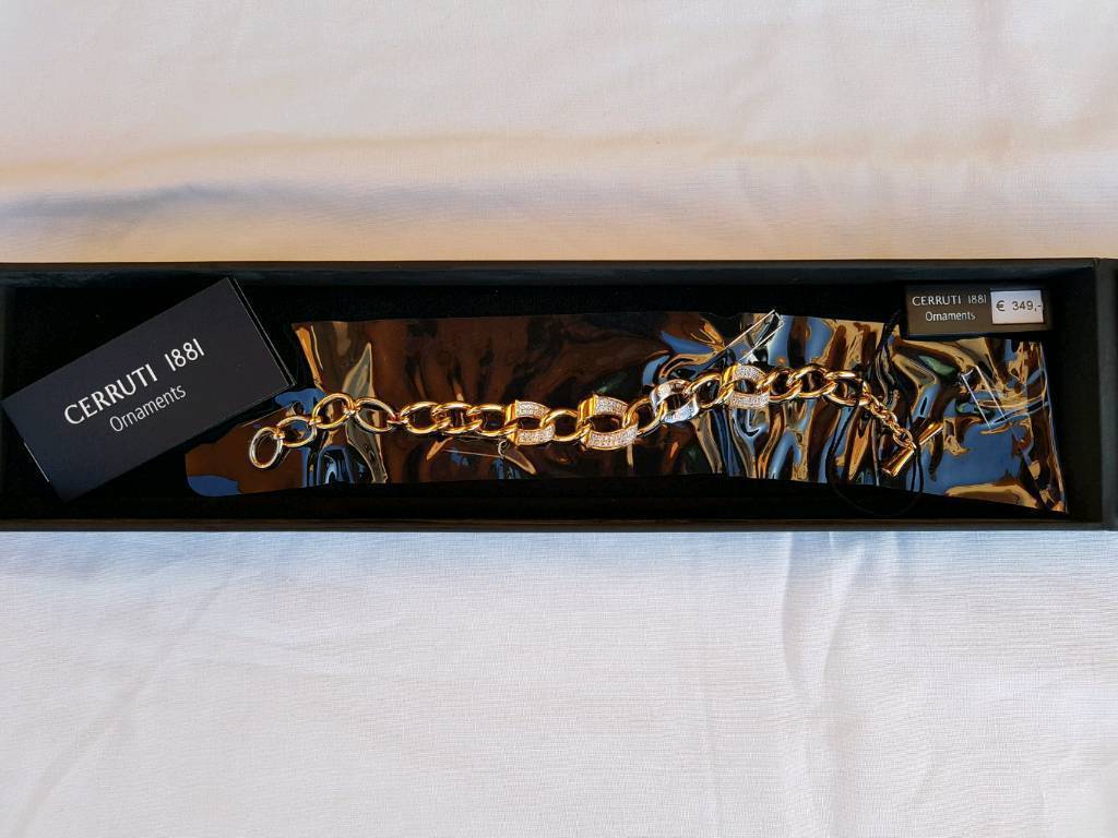 elegantes hochglanzpoliertes CERRUTI Armband mit gravierten Logoehemalige-UVP:*€349,-925er Sterling-Silber goldfarben rhodoniert anlaufgeschützt3 Kettenglieder sind mit glitzernden Zirkoniasteinen verziert1 Kettenglied ist nicht goldfarbenKnebelverschluss mit Logo-GravurGesamtlänge ca. 19 cm ; Gliederbreite ca 1 cmgeliefert in eleganter CERRUTI Geschenkbox |