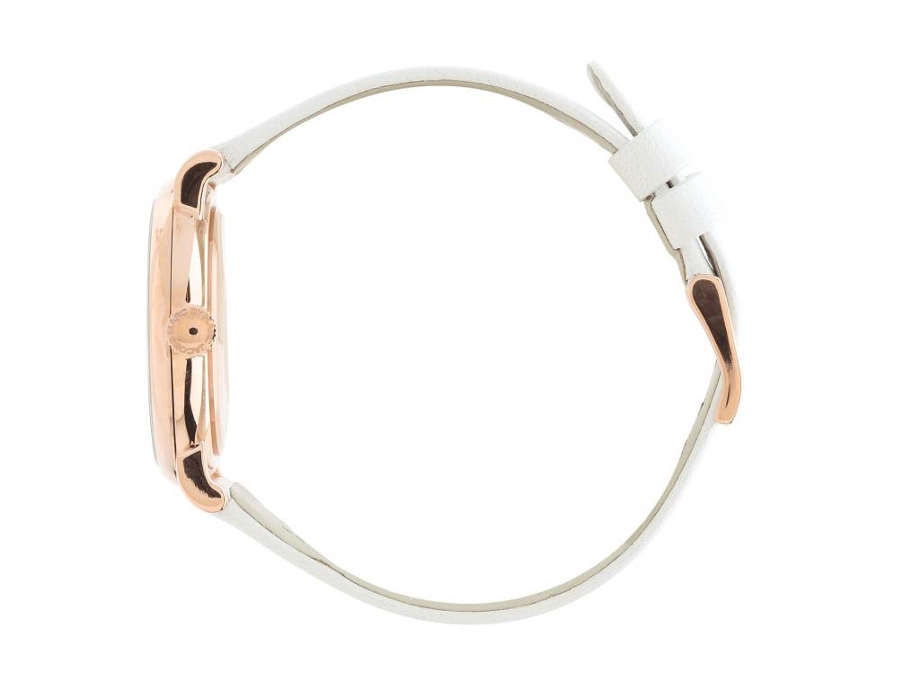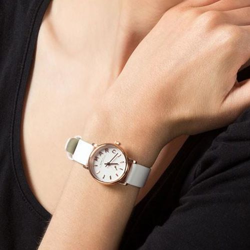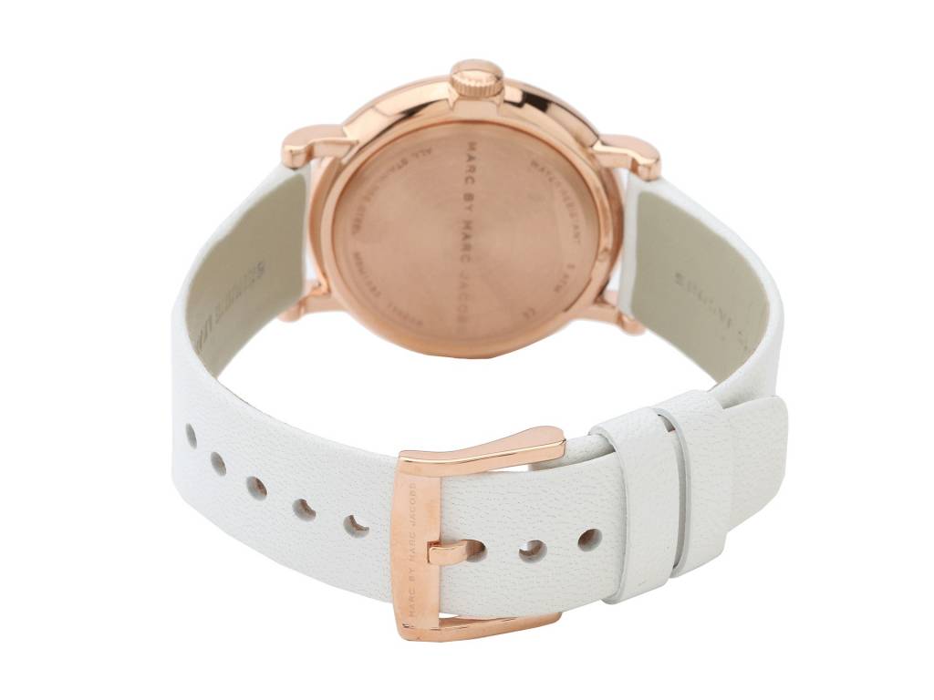 schöne Damen Armbanduhr aus dem Hause Marc Jabobs mit einem geschmeidigen Echtlederarmband. Das Gehäuse aus hochglanzpoliertem rosegoldfarbenem Edelstahl.