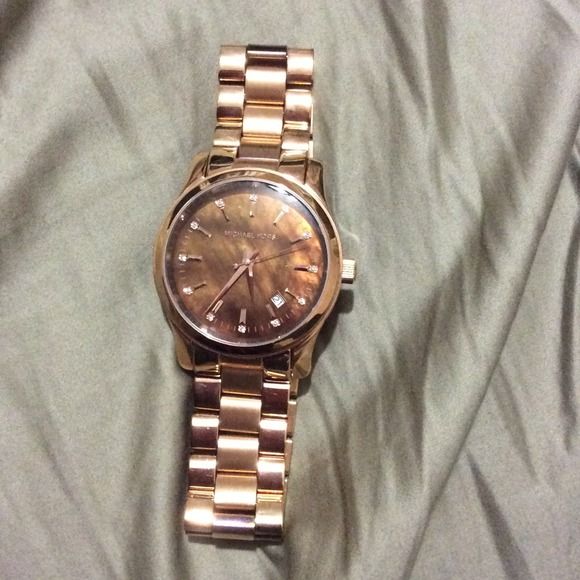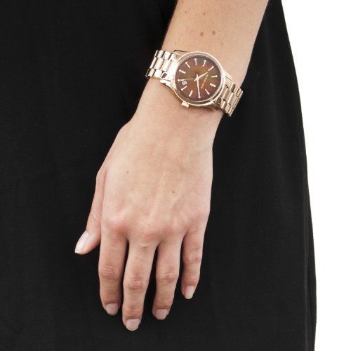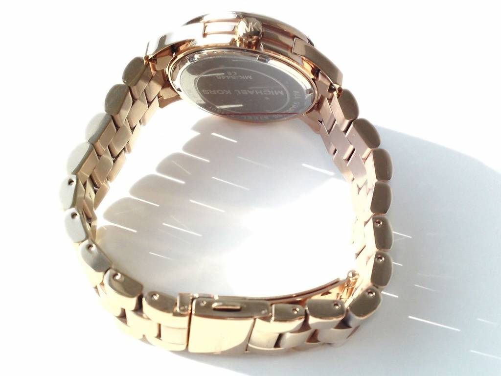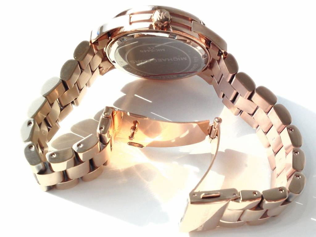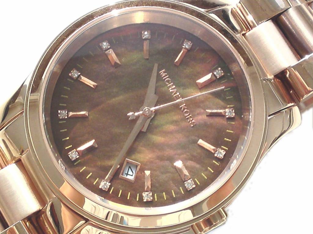 schöne rosegoldfarbene Michael Kors Armband-Damenuhr mit perlmutartig-schimmerndem braunem Zifferblatt. Das Modell MK5445 RUNWAY ist eben etwas besonderes.