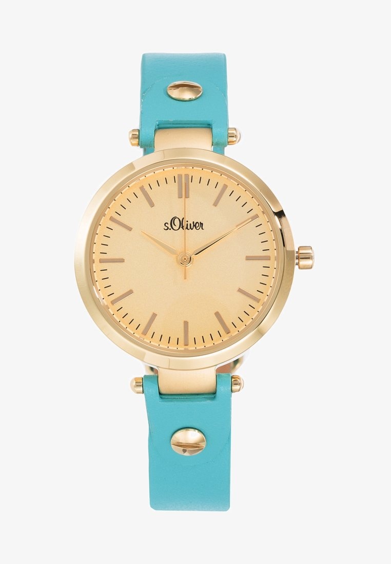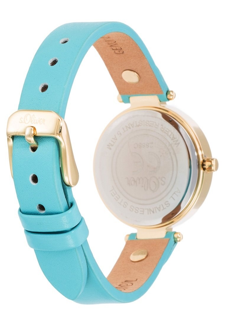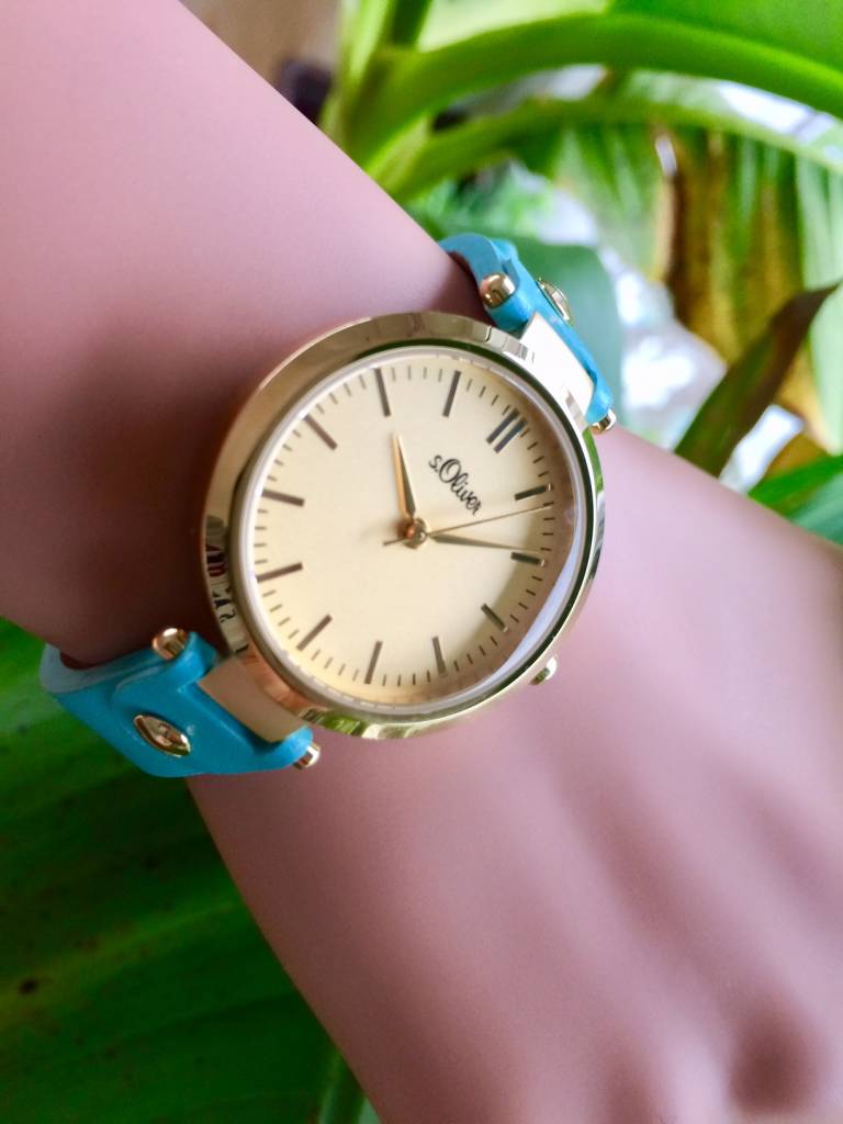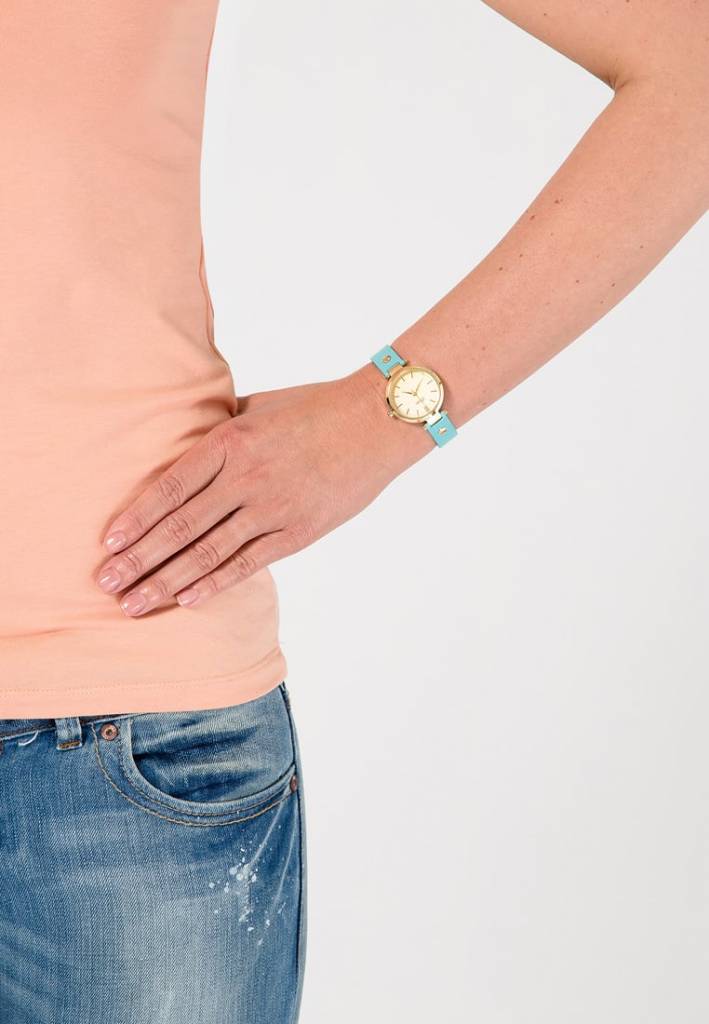 Damenuhr mit trendigem Gehäuse aus polierten Edelstahl mit goldfarbenem Beschichtung überzeugt mit der perfekten Kombination aus schlichter Eleganz und originellem Design. Highlight ist das schmale, hochwertig verarbeitete, türkis-blaue Lederband.